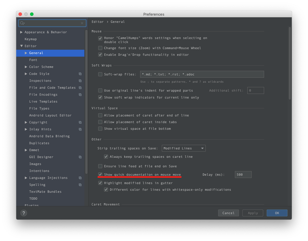 설정(⌘ + ,) - Editor - General 메뉴에 진입하여 Show quick documentation on mouse move 항목을 체크하시면 됩니다.