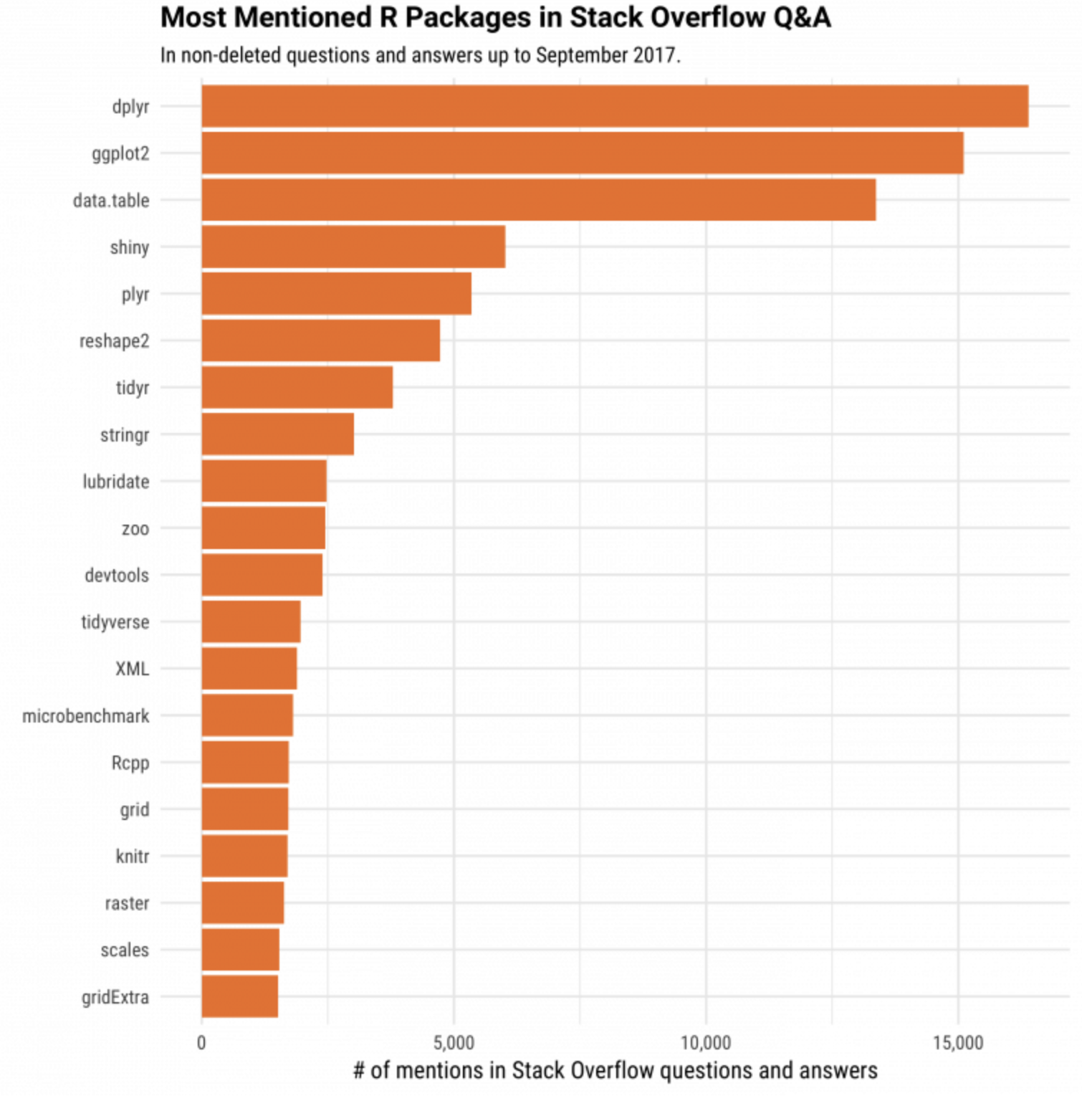 R의 주요 용도는 통계학, 시각화 및 머신 러닝입니다. 아래 그림은 StackOverflow에서 어떤 R 패키지가 가장 많은 질문을 받았는지를 보여줍니다. 상위 10위권에 데이터 사이언스의 워크플로우, 즉 데이터 준비 및 결과 전달과 관련된 내용이 대부분 포진해있습니다.