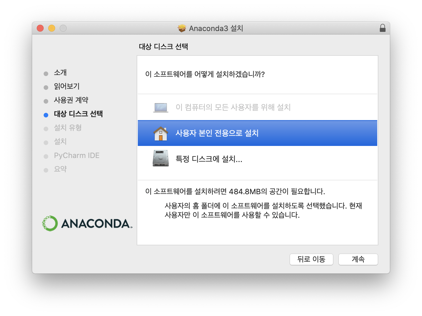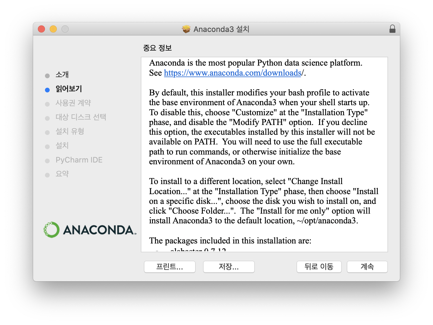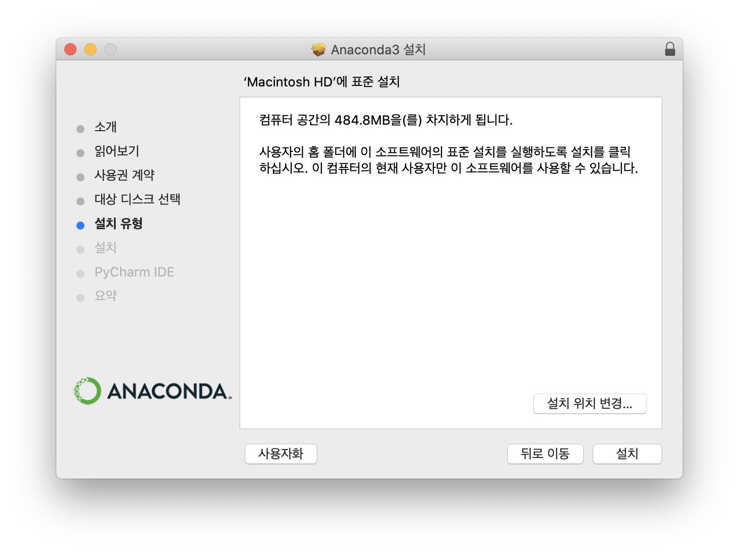 Finder에서 Anaconda를 설치한 경로를 찾아 anaconda3 폴더를 우클릭 후 정보 가져오기를 클릭하면 위와 같은 창이 노출되는데 위치를 블럭지정한 뒤 우클릭하여 복사하면 정확한 경로를 획득할 수 있습니다.
