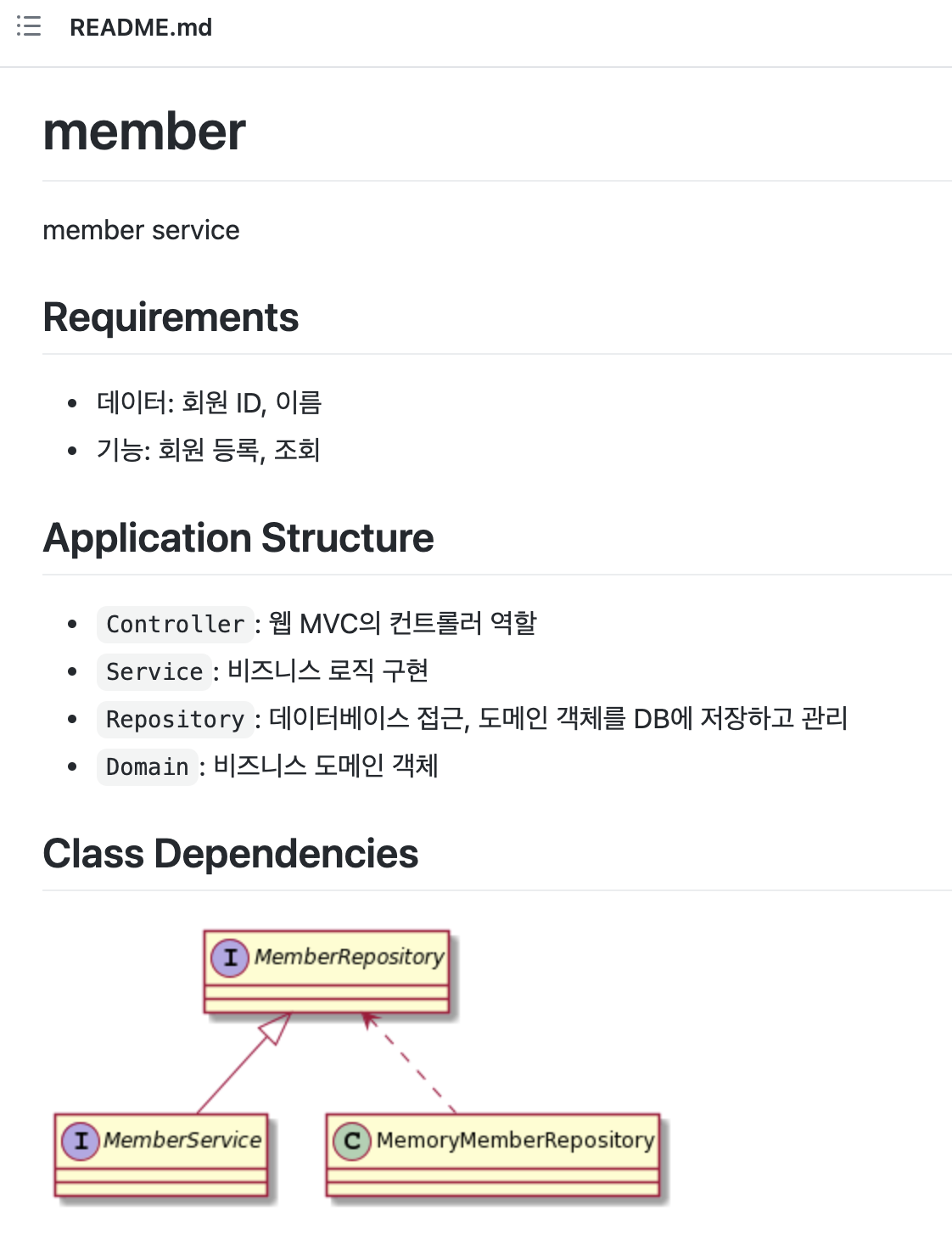 @enduml저는 세 개의 클래스 관계를 나타내기 위해 위 처럼 작성하였습니다. MemberService가 MemberRepository를 사용하고 MemoryMemberRepository가 MemberRepository를 상속(구현)하는 구조입니다. (자세한 문법 정보는 여기)