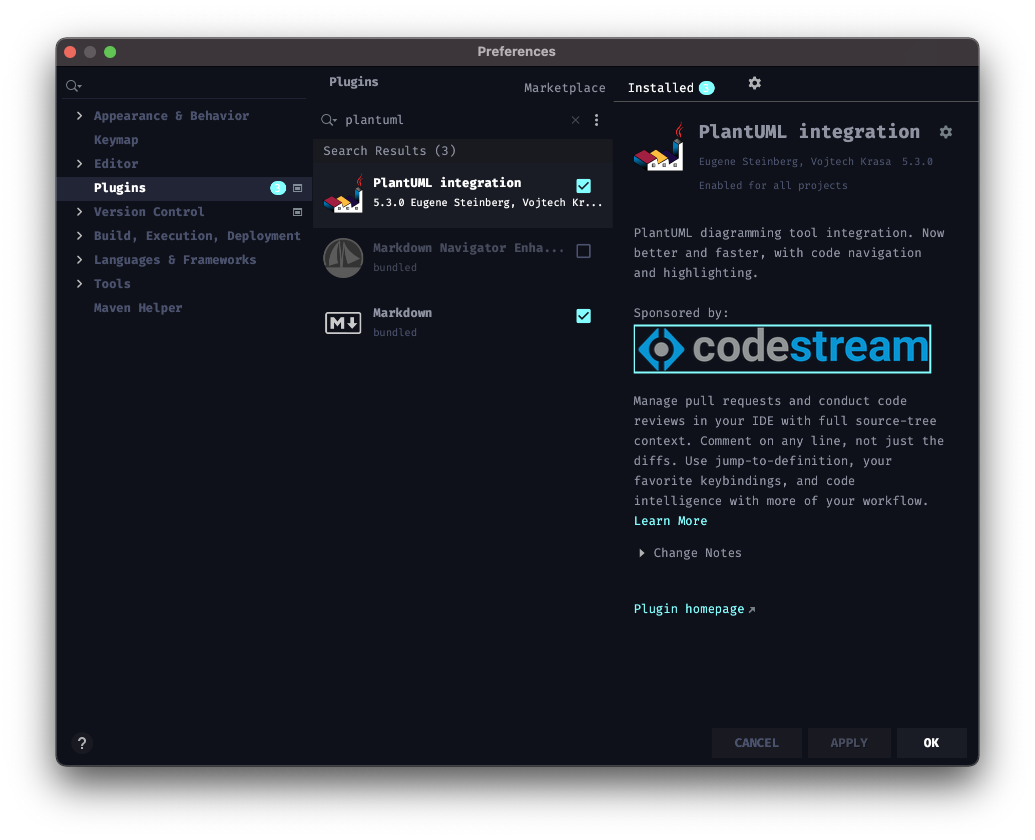 먼저 IntelliJ 플러그인 중 plantUML integration을 설치합니다. 이 플러그인은 자동완성 기능등을 제공하는 것으로 plantUML 웹사이트 내에서도 puml 파일을 작성할 수 있습니다.