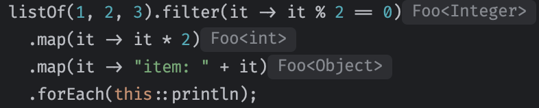 이 중 파라미터 이름을 알려주거나 메서드 체이닝에서 어떤 타입을 반환했는지 바로바로 보여주는 힌트는 같은 라인에 표시되기 때문에 코딩할 때 도움이 되기도 합니다.