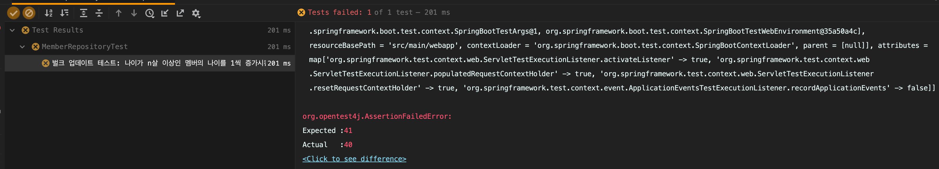 DB에서 다시 조회해 온 member 객체는 20살 이상이기 때문에 한 살이 추가된 41살이 되어야 합니다.
