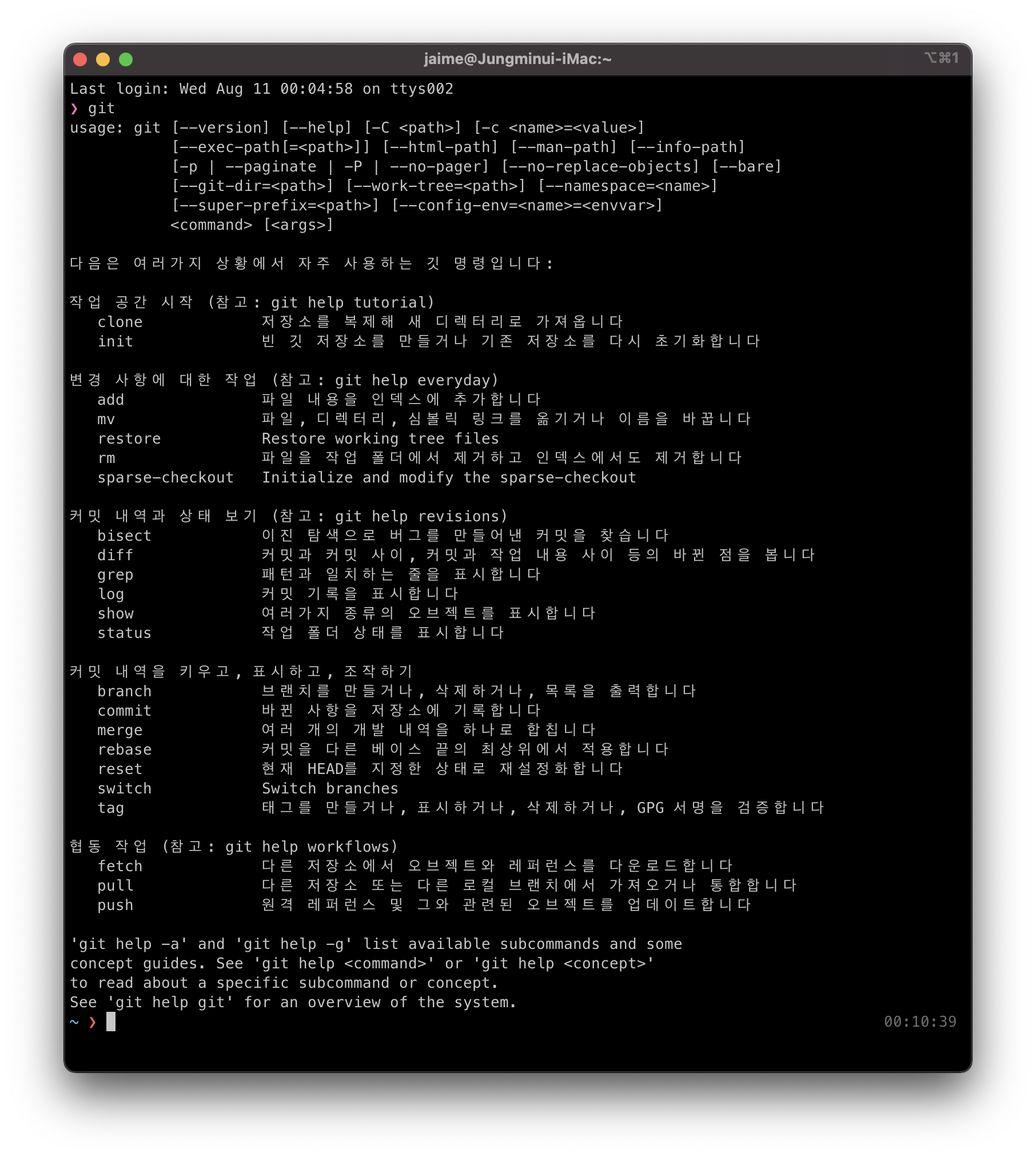 얼마 전 zsh 테마를 적용하고나니 git 명령어가 한글로 바뀌는 현상이 발생했습니다.
